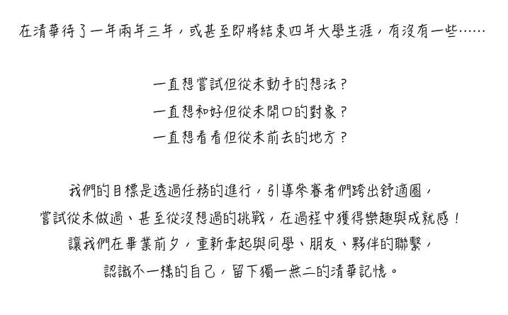 你認識清華嗎?習以為常的校園中,有沒有一些你所知甚少的角落?而學校生活中再熟悉不過的朋友、同學、老師,相處久了似乎也就是那樣了,來做些新鮮的事情吧!